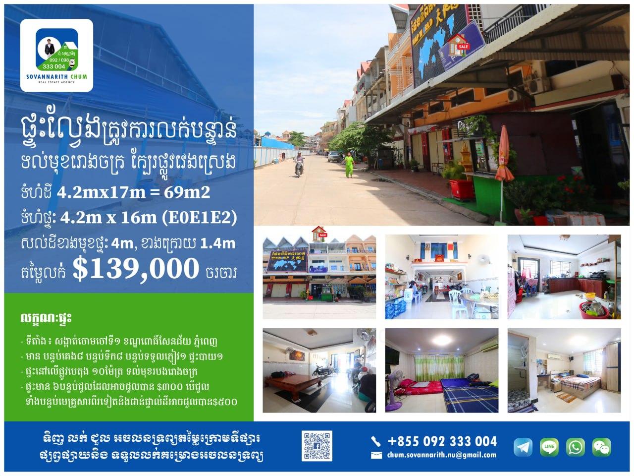 - ផ្ទះនៅលើផ្លូវបេតុង 10m ទល់មុខរបងរោងចក្រ សល់ដីមុខផ្ទះ 4m និង ក្រោយផ្ទះ 1.4m